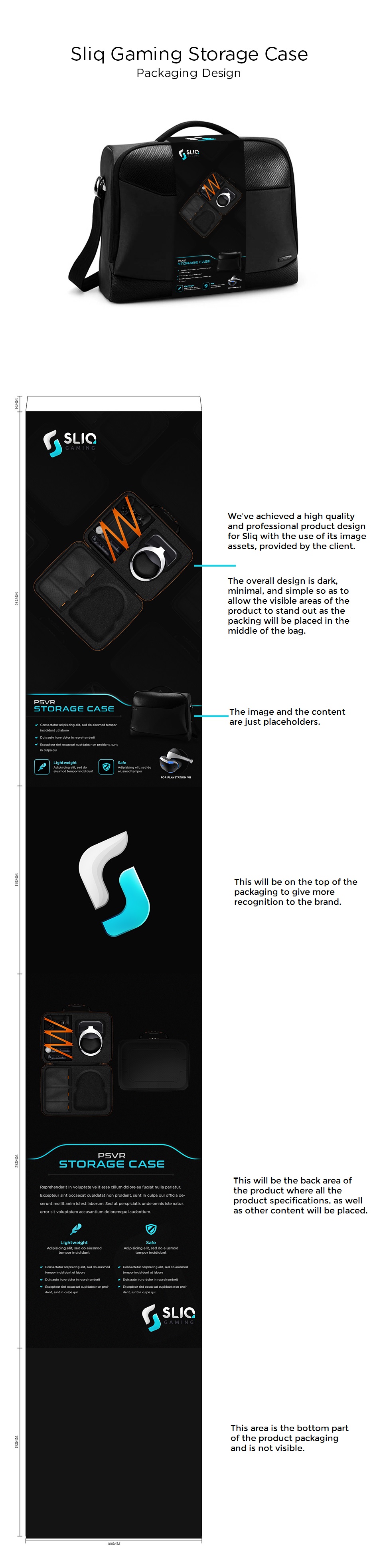 For Sliq Gaming's storage case sleeve, we opted for a simple, minimalist approach to let the images and content stand out. The dominance of the black color added to the sophistication of this design.