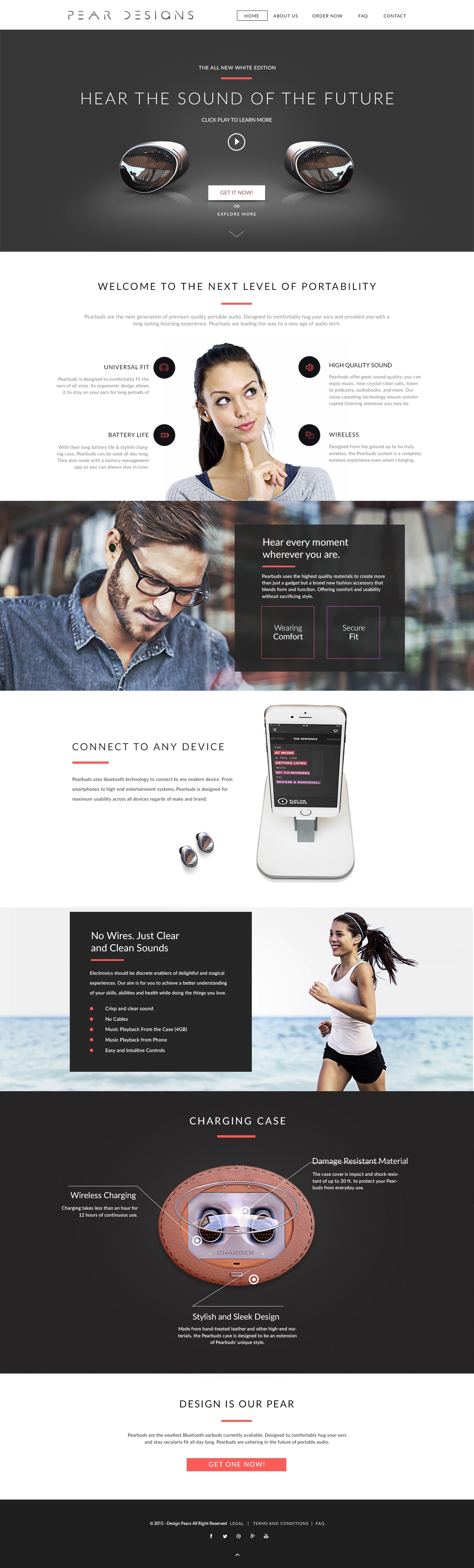 Pear Designs is a team of innovators and creatives pushing towards the next step in consumer technology: complete wirelessness. Their wireless earphones is a testament to their ingenuity and innovations in consumer electronics; blending form and function into a synchronized whole. The website we made for them is no different showcasing everything that makes them special without losing its elegance.